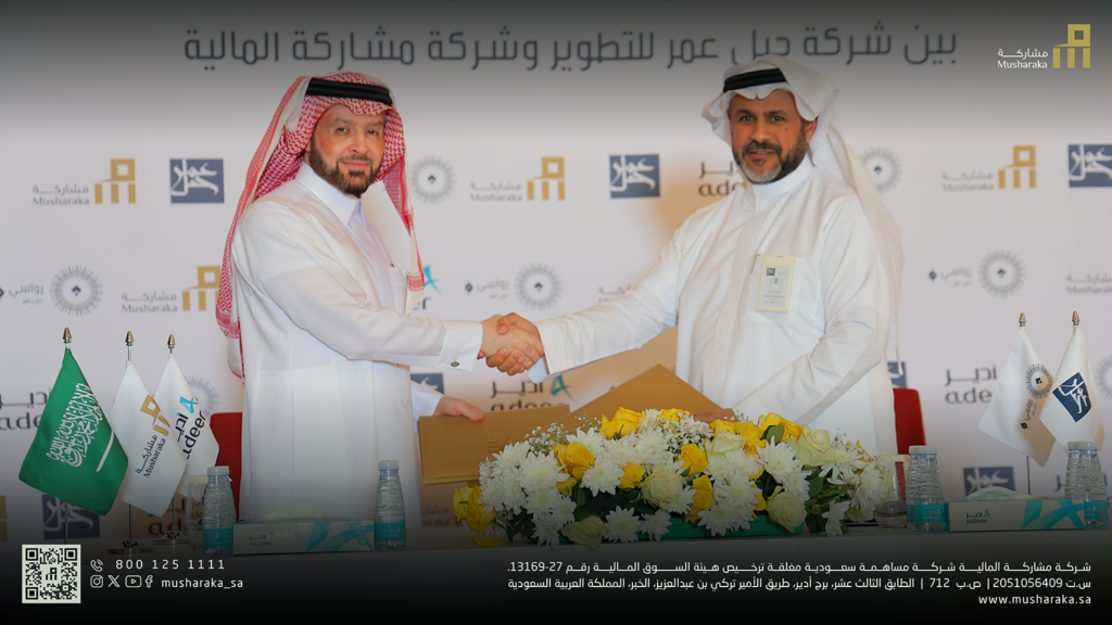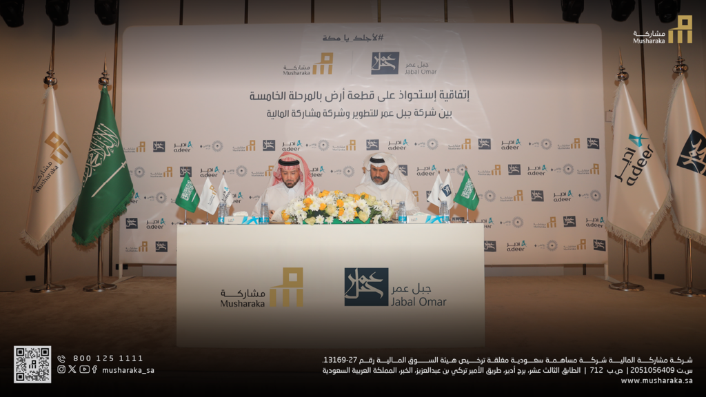 Musharaka Capital announced the signing of an agreement with Jabal Omar Development Company to acquire a plot of land within the fifth phase of the Jabal Omar Project in Makkah, as well as another agreement with Ladun Investment Company aimed at establishing a real estate development fund.